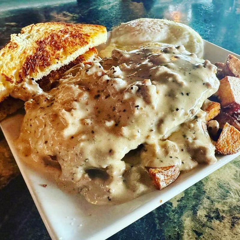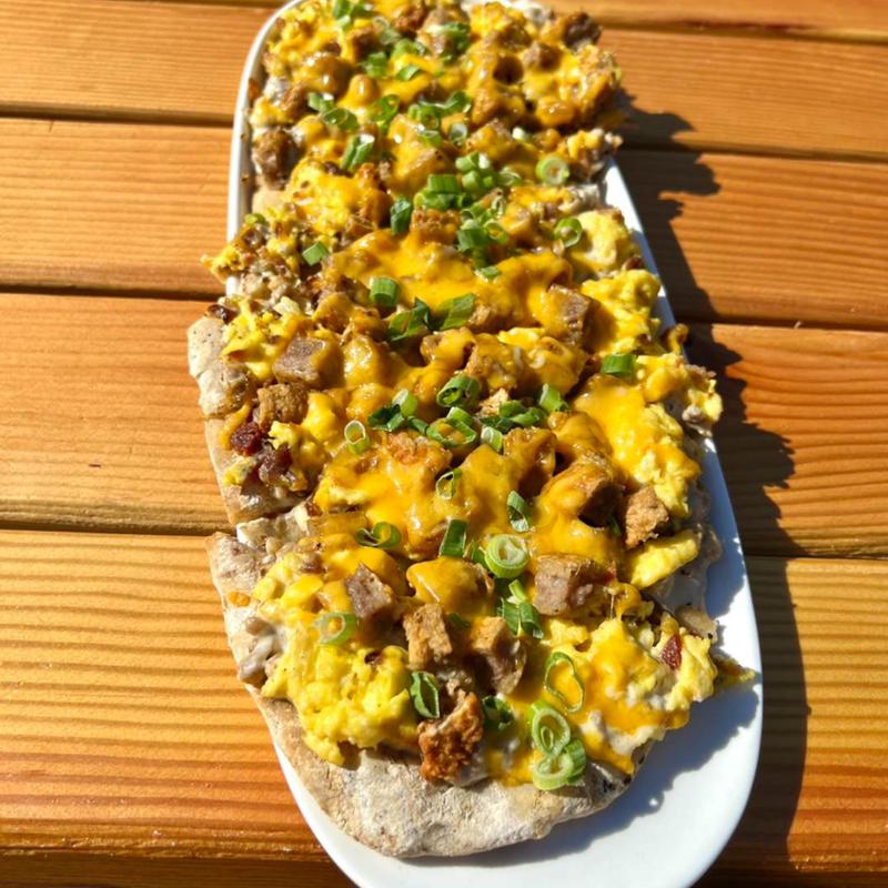 House gravy, scrambled *eggs, country-fried steak, bacon, cheddar, & green onion served on a crisp flatbread.