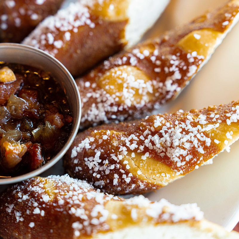 Bavarian soft pretzel sticks. Served with house-made queso & our Award winning! bacon onion jam.