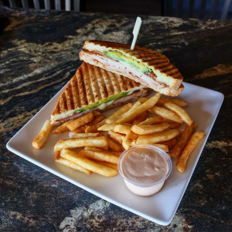 Bacon, ranch, avocado, mozzarella, & smoked turkey served in panini-pressed Artisan sourdough.