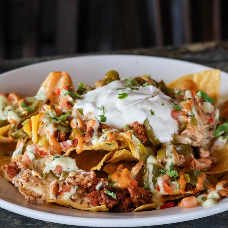 Corn tortilla chips topped with al pastor, house-made cheese sauce, pickled jalapeno, cilantro, cilantro lime aioli, sour cream, & Pico de Gallo.
