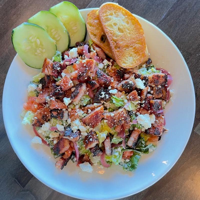 Cajun candied bacon, romaine, tomatoes, pickled onions, cucumbers, & bleu cheese crumbles, tossed in bleu cheese dressing. Served with baguette.