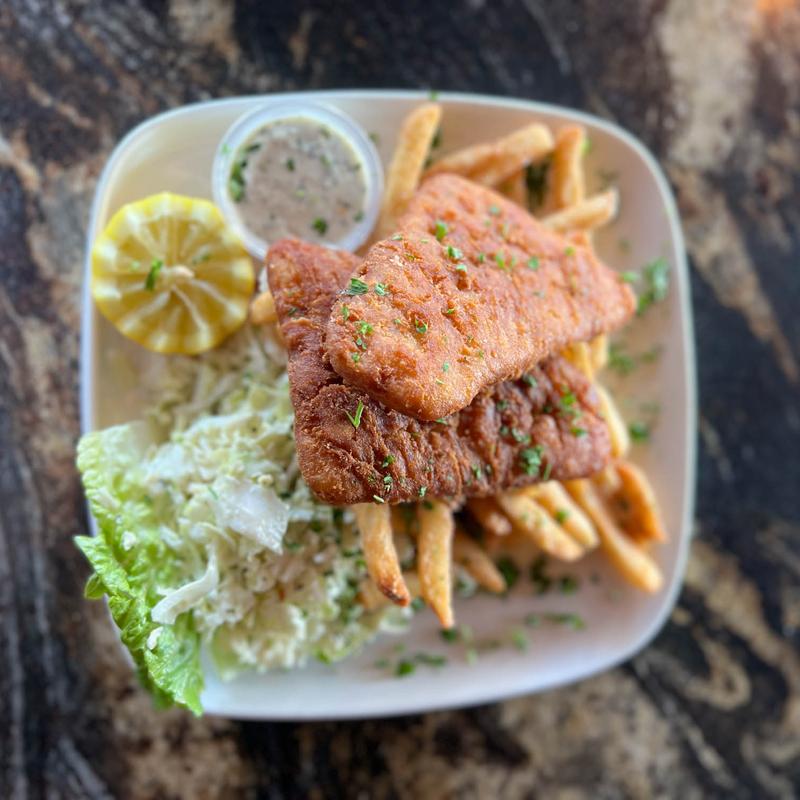 2-pc | 3-pc • Hand breaded wild caught Pacific cod served with coleslaw, seasoned fries, lemon, & house-made tartar.